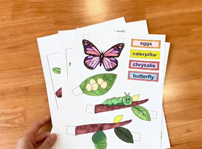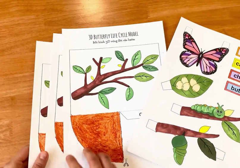 - Sử dụng mô hình này hay bất kỳ sản phẩm thủ công nào khác để hướng dẫn con tập nói thuyết trình (show & tell) cũng là một cách tiếp cận sáng tạo giúp con phát triển khả năng ngôn ngữ và tự tin thể hiện bản thân. Mời các cô chú anh chị cùng xem cháu Moon Quang Đăng 6 tuổi trình bày bằng tiếng Anh và cháu Chíp Vy Anh 7 tuổi trình bày bằng tiếng Việt giới thiệu về mô hình vòng đời của bướm: https://www.youtube.com/shorts/-S8UQW2SiBM (Moon) và https://www.youtube.com/shorts/Kp_5HSX7PpI (Chíp)