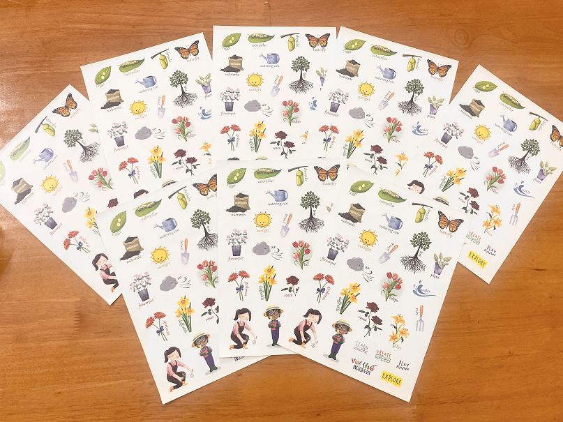 Đơn hàng được tặng kèm 1 tờ sticker có các hình ảnh và từ vựng tiếng Anh về chủ đề thiên nhiên, trong đó có hình ảnh các giai đoạn trong vòng đời của bướm.